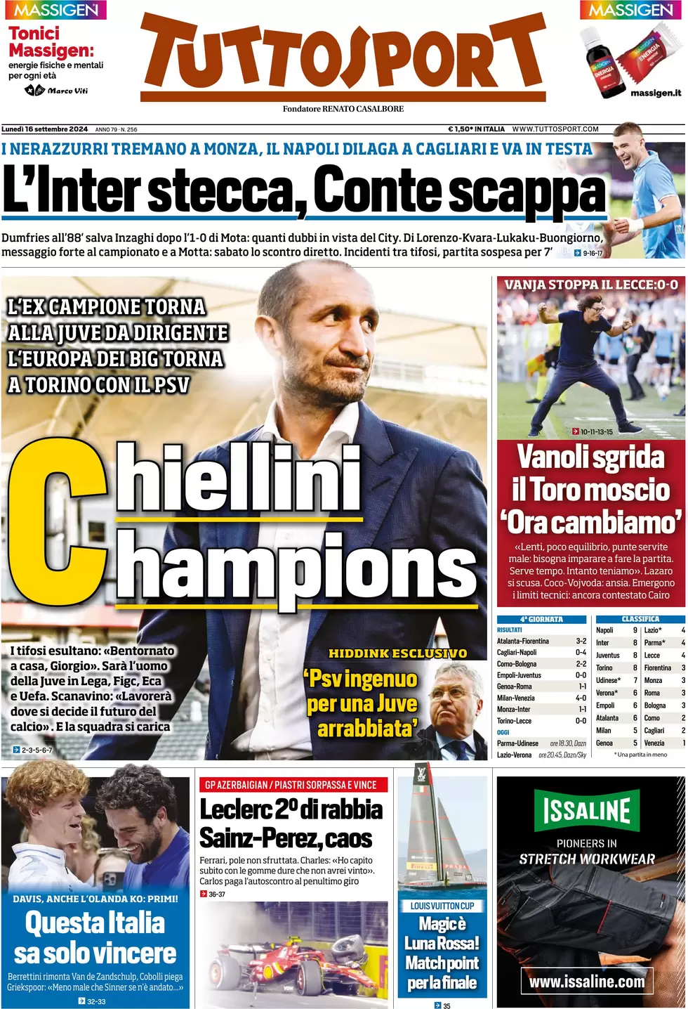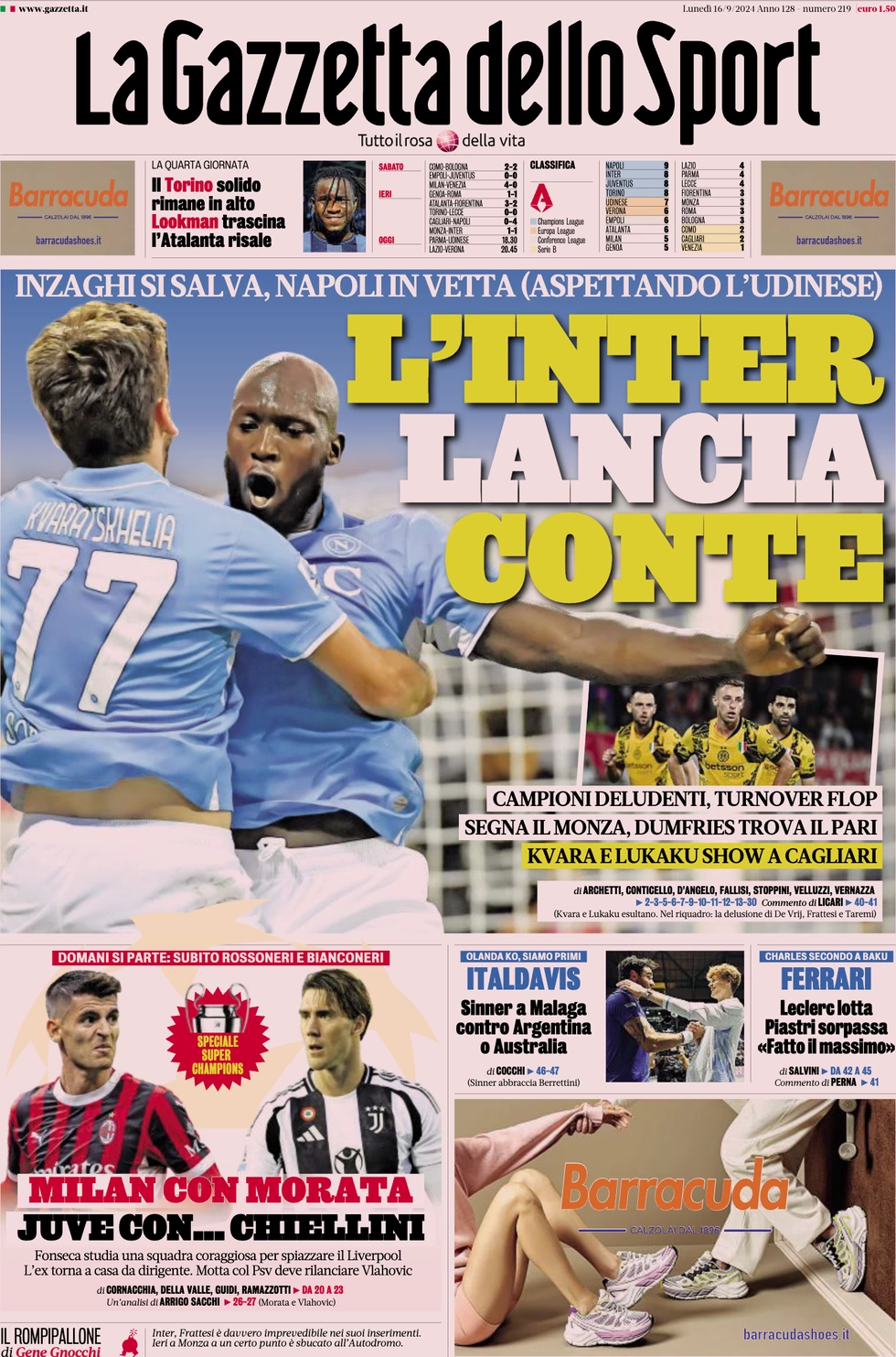 Disappointing champions, turnover flop. Monza scores and Dumfries gets the equaliser. Kvara and Lukaku show in Cagliari.