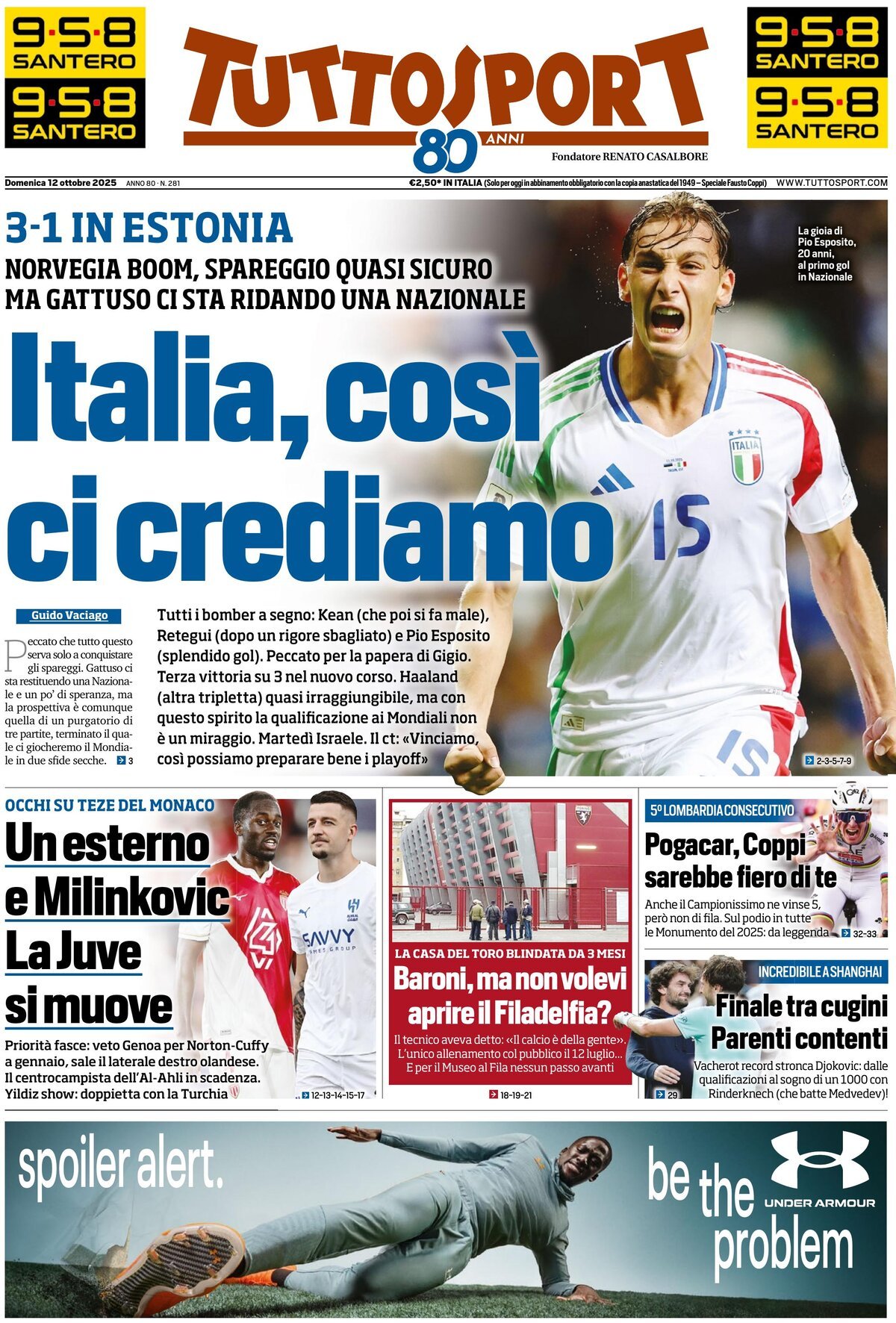 Gattuso beats Estonia 3-1 in Tallinn: Pio Esposito scores too. Haaland beats Israel 5-0.